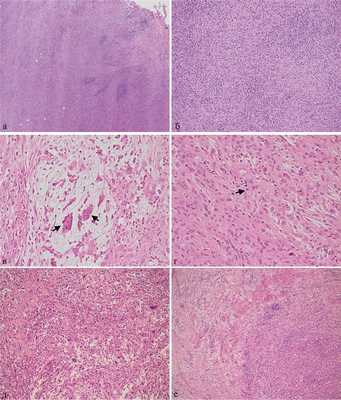 Характерным признаком МИФС при обзорном увеличении была миксоидно-гиалинизированная (фиброзированная) строма. При этом площадь миксоидных участков варьировала, но ни в одном случае не занимала более 50% (рис. 1). В 6 случаях опухоль имела отчетливую нодулярность (см. рис. 1, а). Гиповаскулярные миксоидные участки перемежались с фиброзно-коллагенизированными фокусами, васкуляризированными аналогично грануляционной ткани.