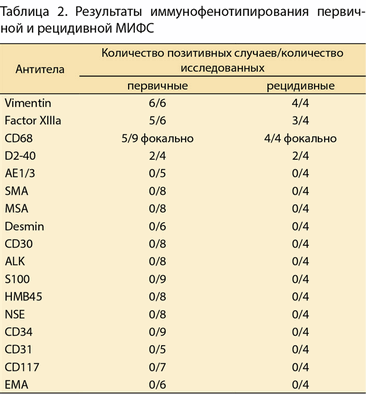 МИФС — редкая опухоль мягких тканей, имеющая излюбленную локализацию в дистальных отделах конечностей. Несмотря на вариабельность морфологической картины от саркомоподобной до псевдовоспалительной, правильная диагностика основывается на выявлении комплекса характерных гистологических признаков. Иммунопрофиль МИФС не является специфичным и не занимает лидирующего положения в диагностике.