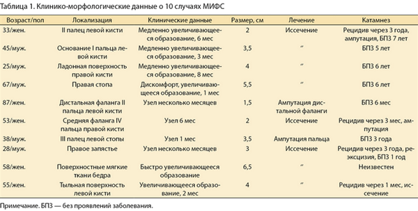 Таблица 1. Клинико-морфологические данные о 10 случаях МИФС Примечание. БПЗ — без проявлений заболевания.