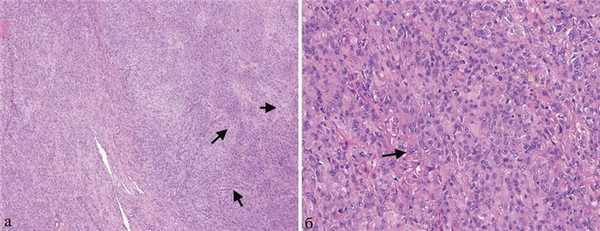 Рис. 4. Рецидивная МИФС (см. табл. 1: женщина 53 лет), проявившая выраженную гистологическую прогрессию. Отмечается отсутствие миксоидных зон, увеличение клеточности и полиморфизма, появление сосудов типа аркад (а — стрелки); б — крупная эпителиоидная клетка с полиморфным ядром, выраженным ядрышком и обширной эозинофильной цитоплазмой (стрелка). а — ×50, б — ×400.