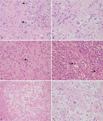 Рис. 2. Клеточный состав МИФС. а — крупные эпителиоидные клетки (стрелки) с крупными ядрами и эозинофильными ядрышками, напоминающие ганглионарные клетки или вироциты; б, в — двуядерные опухолевые клетки, напоминающие клетки Рида—Штернберга; г — единичные эпителиоидные клетки (стрелки), напоминающие клетки Ходжкина, среди веретеновидноклеточной популяции. Имеют место слабый полиморфизм и диффузная воспалительная инфильтрация; д — липобластоподобные клетки в миксоидном фокусе опухоли; е — в центре клетка с вакуолизированной цитоплазмой, полиморфным изъеденным ядром, похожая на плеоморфный липобласт. а, б, в, г, е — ×400, д — ×200.