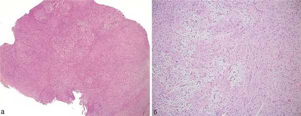 Рис. 1. Гистологическая архитектура МИФС. а — тонкие фиброзные септы делят миксоидно-гиалинизированную опухоль на нодули; б — миксоидные участки чередуются и контрастируют с фиброзно-гиалинизированными зонами. Здесь и на рис. 2—4: окраска гематоксилином и эозином. а — ×15; б — ×50.