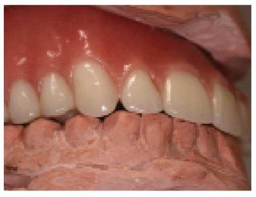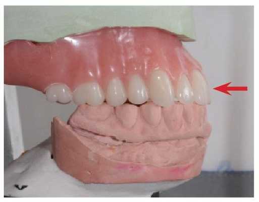 Фото 21. Ограничение контактов до лингвальных бугров на съемном протезе верхней челюсти в области дистальных зубов.