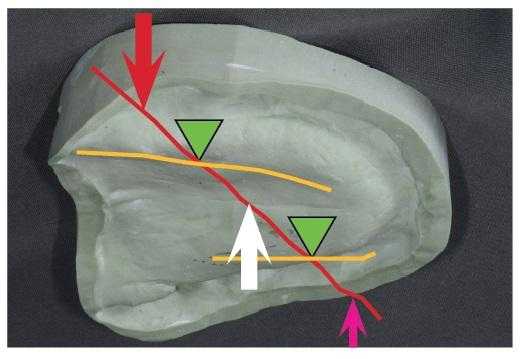 Восковой валик контурируется и корригируется по форме, чтобы соответствовать положению окружающих структур, включая: