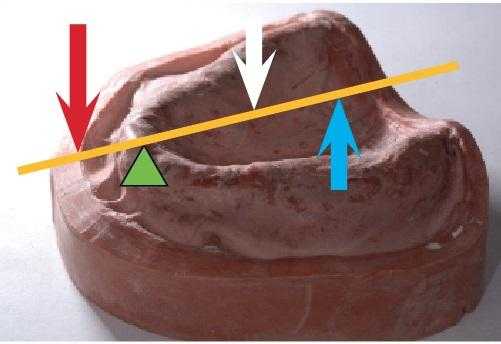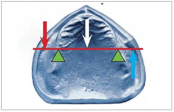 После установки базисных пластин внутрь ротовой полости пациента просят переместить нижнюю челюсть вперед и назад, вправо, а затем назад, влево и затем назад. Эта серия движений повторяется несколько раз, и нацелена на тренировку пациента, позволяя депрограммировать мышцы, чтобы гарантировать позиционирование мыщелков в центральном соотношении. После этого ударную пластину покрывают перманентным черным маркером, и пациента просят снова выполнить функциональные движения для трассировки. Когда штифт находится в точке пересечения трех линий трассировки, это значит, что челюсть находится в центральном положении (фото 9). С помощью бора на ударной пластине в точке пересечения этих линий формируется ямка. Затем пациента просят передвинуть нижнюю челюсть назад до тех пор, пока штифт не попадет в ямку. При таком фиксированном положении между пластинками вводят материл для регистрации прикуса, который позволит зафиксировать достигнутое пространственное положение челюстей.