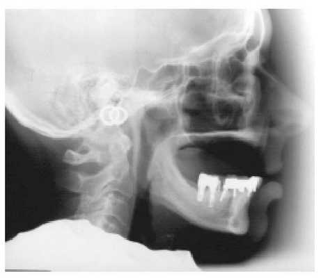 Еще одним фактором, определяющим вертикальный параметр окклюзии, является доступное «заднее пространство для произношения». Последнее представляет собой промежуток между задними зубами в момент, когда нижняя челюсть передвигается вперед для произношения звука «С». Величина промежутка между задними зубами также будет варьировать в зависимости от класса скелетного соотношения, отмечающегося у пациента: у пациента со 2 классом соотношений величина такового будет больше, чем у пациента с 1 классом. Если же при произношении звука «С» задние зубы полностью соприкасаются, то это значит, что вертикальный размер окклюзии является слишком большим. Метод оценки надлежащего вертикального пространства для произношения, который нацелен на регистрацию параметра высоты прикуса, не стоит путать с методом регистрации свободного пространства в положении центрального соотношения. Свободное пространство в положении центрального соотношения представляет собой пространство между окклюзионными поверхностями верхних и нижних зубов в состоянии, когда мышцы нижней челюсти полностью расслаблены, в то же время при оценке надлежащего вертикального пространства для произношения мышцы являются активными. Положение челюсти в состоянии покоя является крайне вариабельным, и, следовательно, не может быть использовано для определения высоты прикуса (фото 5).