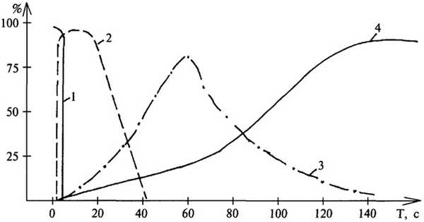 Рис. 38. Участие различных источников энергии в энергообеспечении мышечной деятельности в зависимости от ее длительности (по Н.Н. Яковлеву, 1983): 1 - расщепление АТФ; 2 - распад Кф; 3 - гликолиз; 4 - аэробное окисление