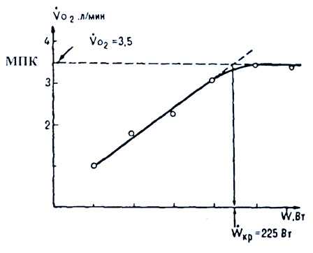 Потребление кислорода при мышечной работе увеличивается, как известно, пропорционально ее мощности. Однако такая зависимость имеет место лишь до определенного уровня мощности. При некоторых индивидуально предельных ее значениях (так называемой критической мощности) резервные возможности кардиореспираторной системы оказываются исчерпанными и потребление кислорода более уже не увеличивается даже при дальнейшем повышении мощности мышечной работы. Таким образом, максимальное потребление кислорода можно зарегистрировать только при нагрузках критической или надкритической мощности, когда функциональная мобилизация системы транспорта и утилизации кислорода достигает максимума (так называемого кислородного потолка). О максимизации аэробного обмена свидетельствует плато на графике зависимости потребления кислорода от мощности мышечной работы.