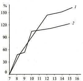 Рис. 10.1. Развитие умственной работоспособности с возрастом: 1 - скорость работы; 2 - точность работы. За начало работы приняты показатели работоспособности семилетних детей