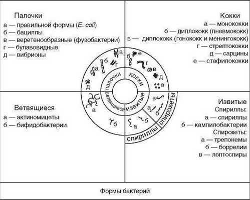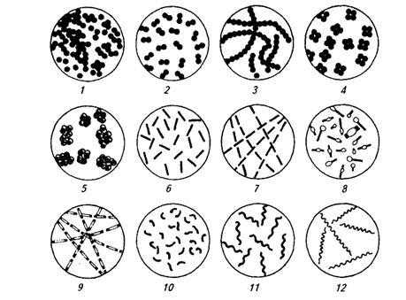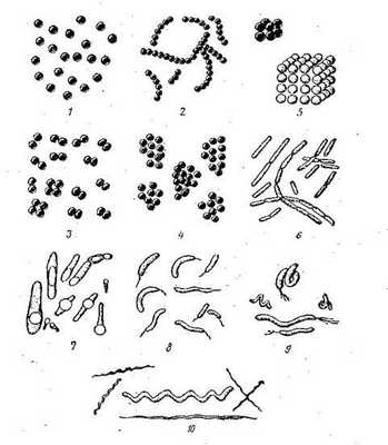 Шаровидные бактерии: 1 — микрококки; 2 — стрептококки; 3 — диплококки и тетракокки; 4 — стафилококки; 5 — сарцины; палочковидные: 6 — палочки без спор; 7 — палочки со спорами (бациллы); извитые: 8 — вибрионы; 9 — спириллы; 10 — спирохеты.
