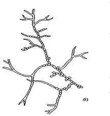 Актиномицеты (от греч. aktis — луч, mykes — гриб) — лучистые грибы (рисунок 5 а). Эта группа микроорганизмов занимает промежуточное положение между бактериями и грибами, поэтому ее представителей называют грибобактериями. Они одноклеточные, как бактерии, но образуют мицелий, как грибы; диаметр нитей у них очень мал, как у бактерий (не более 0,5— 0,8 мкм), но гифы мицелия длинные и ветвистые, как у грибов. У актиномицетов длина ветвящихся нитей достигает нескольких миллиметров, мицелий грибов в длину — нескольких сантиметров. С грибами актиномицетов объединяет также способность размножаться спорами.
