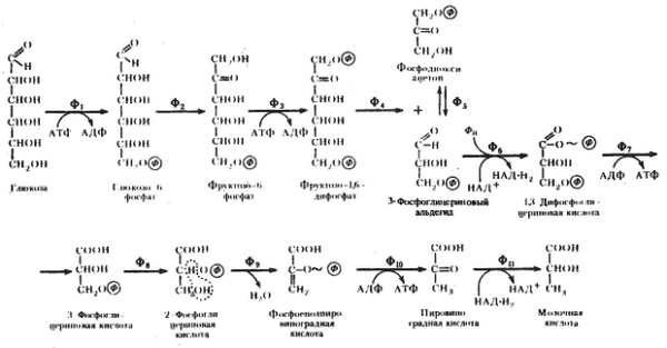 Рис. 9.2. Схема гликолиза в анаэробных условиях:Ф1 — гексокиназа; Ф2 — глюкозофосфатизомераза; Ф3 — фофсофруктокиназа; Ф4 — фруктозо-1,6-дифосфатальдолаза; Ф5 — триозофосфатизомераза; Ф6 — 3-ФГА-дегидрогеназа; Ф7 — фофсоглицерокиназа; Ф8 — фосфоглицеромутаза; Ф9 — енолаза; Ф10 — пируваткиназа; Ф11 — лактатдегидрогеназа
