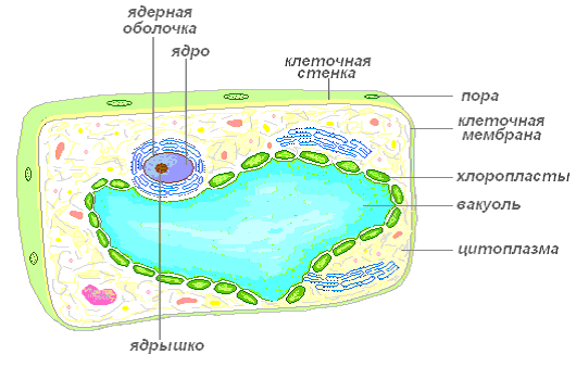 Рассмотрим клетку как структурно-функциональную единицу организма. Снаружи клетка покрыта плотной клеточной стенкой, в которой имеются более тонкие участки — поры. Под ней находится очень тонкая плёнка — мембрана, покрывающая содержимое клетки — цитоплазму. В цитоплазме есть полости — вакуоли, заполненные клеточным соком. В центре клетки или около клеточной стенки расположено плотное тельце — ядро с ядрышком. От цитоплазмы ядро отделено ядерной оболочкой. По всей цитоплазме распределены мелкие тельца — пластиды.