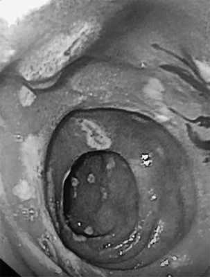 Рис. 1. Множественные эрозии двенадцатиперстной кишки под фибрином с вкраплением гематина.