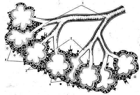 1- терминальная бронхиола; 2- альвеолярные ходы; 3- альвеолы; 4- капилляры с эритроцитами.