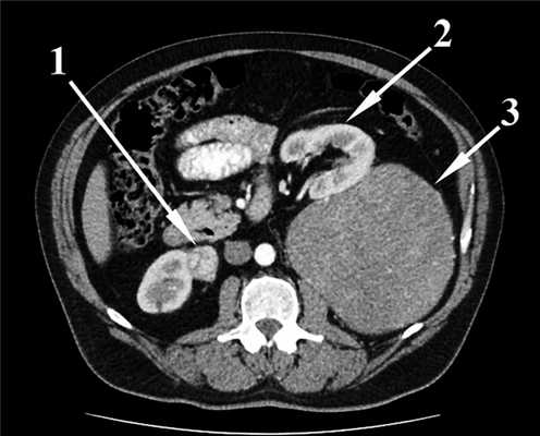 Результаты компьютерной томографии брюшной полости и забрюшинного пространства с внутривенным контрастированием подтвердили наличие неорганного объемного образования левого забрюшинного пространства, интимно прилежащего к левому надпочечнику, краниокаудальный размер которого был равен 241 мм, а максимальный поперечный размер — 143 мм. Структура образования в верхних 2/3 была относительно однородная, в нижней трети — неоднородная за счет наличия двух узлов, без контрастного усиления, что расценено как зона распада. Также визуализировано объемное образование нижнего полюса передней поверхности правой почки размером 25×27 мм с неоднородным контрастным усилением (рис. 1). Рис. 1. Компьютерная томограмма органов брюшной полости (уровень LI—II). 1 — образование нижнего полюса правой почки; 2 — левая почка; 3 — неорганная забрюшинная опухоль.