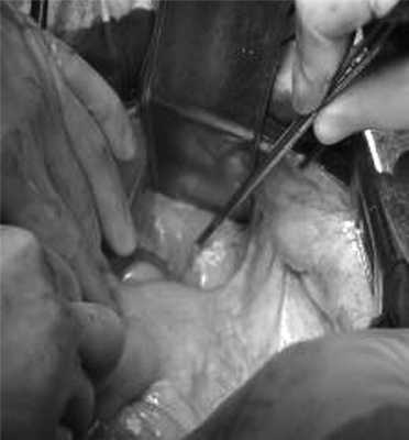 Произведена мобилизация прямой кишки по левой и задней полуокружности, а также пресакрально до мышц тазового дна с соблюдением всех онкологических правил (рис. 5). По левой боковой стенке таза опухолевая капсула интимно прилежит к внутренней подвздошной вене и артерии, острым путем последняя мобилизована от магистральных сосудов.