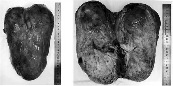 Особенностью данного клинического наблюдения является то, что опухоль достигла гигантских размеров с минимальными клиническими проявлениями. Несмотря на тщательное дообследование, крайне сложно представлялась постановка правильного клинического диагноза до операции.