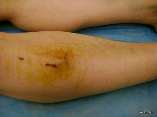 На фото - осумкованная гематома голени (показана стрелкой). Рядом и выше видны ссадины, полученные при ушибе. На видео ниже эта гематома прооперирована.