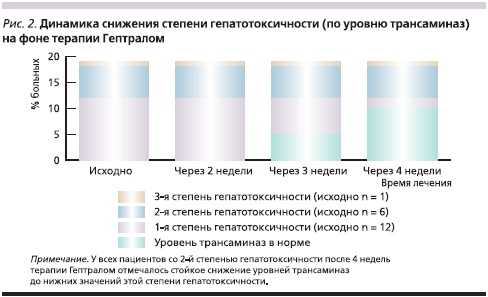 Для нормализации уровня трансаминаз при 2-й степени гепатотоксичности потребовался более длительный прием Гептрала ®: у 2 пациентов - 2 месяца, у 1 - 3, у 3 - 4 месяца (химиотерапия продолжалась без изменения доз).