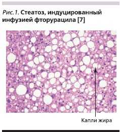 В 1920 г. впервые описана обструкция и дилатация печеночных синусов (венооклюзионное заболевание) как летальная интоксикация в результате употребления ядовитых растений. Данная морфологическая форма характеризуется повреждением синусоидальных эндотелиальных клеток вследствие активации металлопротеиназ и оксидативного стресса [7].На рис. 1 представлена морфологическая картина индуцированного цитостатиками стеатоза, которая характеризуется наличием больших капель жира в гепатоцитах. В среднем частота стеатоза составляет 30 %.