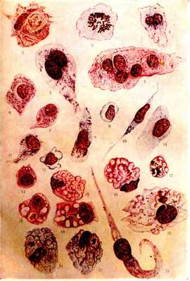 1 — макрофаг, фагировавший полибласта; 2 — митоз ядра полибласта; 3,4 — прямое деление ядра полибласта; 5 — гигантская многоядерная клетка; 6,7 и 13 — полибласты; 11 — полибласт с азурофильной зернистостью; 14 — полибласт с вакуолями в протоплазме; 9 — превращение лимфоцита в гистиоцит; 12 — плазмоцит (лимфоцит, приобретающий активную подвижность); 8, 10 и 23 — профибробласты; 17— моноцит в конечной фазе фагоцитоза; 15, 16—дегенернрованные макрофаги: 18. 19, 20, 21 и 22 — микрофаги (Сенькин).