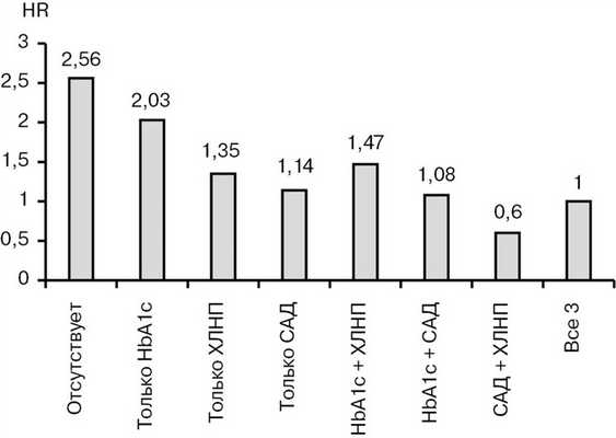 Рис. 1. Независимый вклад HbA1c, САД и ХЛНП в риск развития инсульта при СД 2-го типа [4]. Оптимальный контроль: HbА1c