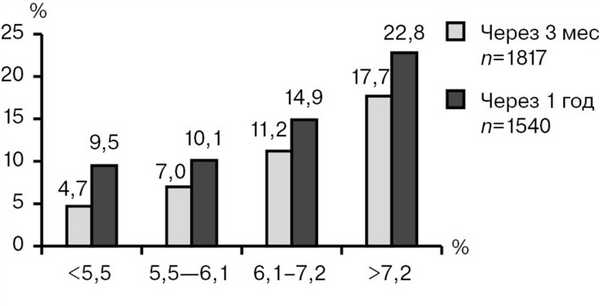 Хроническая гипергликемия рассматривается как один из основных неблагоприятных факторов риска развития любого сердечно-сосудистого события при СД 2-го типа. Глюкоза является активным химическим соединением, вступающим в реакции взаимодействия практически со всеми компонентами циркулирующей крови, белками и липидами, приводящими к образованию конечных продуктов гликозилирования. Эти соединения являются чрезвычайно токсичными для клеток эндотелия сосудов. В результате этих процессов нарушаются механизмы релаксации сосудов, активируется свертывающая система крови, развиваются окислительный стресс и дисфункция эндотелия, что влечет в конечном итоге развитие неблагоприятных сосудистых исходов. Интегральным показателем хронической гипергликемии является степень связывания гемоглобина с глюкозой, определяемая по процентному содержанию HbA1c. Чем выше его уровень, тем более высокие средние значения гликемии отмечались у пациента в последние 2—3 мес. У здоровых этот показатель не превышает 6,5%. Одно из крупнейших исследований в диабетологии — UKPDS [8], в котором прослеживалась судьба больных СД 2-го типа в течение 10 лет от дебюта заболевания, продемонстрировало прямую зависимость развития сосудистых осложнений СД 2-го типа от уровня HbA1c. В этом исследовании было показано, что увеличение HbA1c на каждый 1% повышает риск развития инсульта на 17% и, напротив, снижение HbA1c на 1% уменьшает риск инсульта на 12%. В недавно проведенном китайском исследовании ACROSS-China [9] были получены данные о тесной связи уровня HbA1c и частоты повторного инсульта через 3 мес и 1 год после первого события (рис. 2). При уровне HbA1c более 7,2% частота повторного инсульта через 3 мес составляла 17,7, а через 1 год — почти 23%.