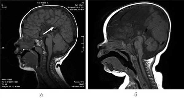 Рис. 5. МРТ головного мозга больного А., 3 года. АМТ. а — сагиттальная проекция. Отсутствие нормально сформированных перикаллезных извилин (стрелка), б — высокое положение III желудочка, радиальная центростремительная направленность борозд медиальной поверхности теменных долей.
