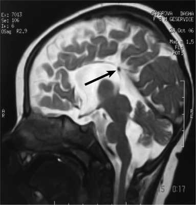 Рис. 3. МРТ головного мозга (сагиттальная проекция) больной С., 7 лет. АМТ (стрелка).