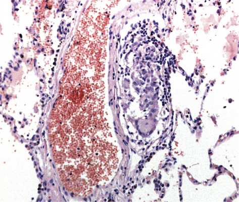 Поражение легких при саркоидозе описано в 90% наблюдений. Морфологическим субстратом саркоидоза является эпителиоидно-клеточная гранулема — компактное скопление мононуклеарных фагоцитов — макрофагов и эпителиоидных клеток. Каждая саркоидная гранулема имеет следующие стадии развития: 1) ранняя или лимфогистиоцитарная гранулема иногда с примесью нейтрофилов (рис. 1); Рис. 1. Ранняя фаза саркоидной гранулемы: периваскулярная лимфогистиоцитарная нечетко очерченная гранулема с единичной многоядерной клеткой. Здесь и на рис. 2—8: окраска гематоксилином и эозином, ×200. 2) гранулема со скоплением эпителиоидных клеток в центре и макрофагов по периферии; 3) эпителиоидно-лимфоцитарная гранулема; 4) гранулема с гигантскими многоядерными клетками (сначала клетки «инородных тел», а в последующем клетки Пирогова—Лангханса); 5) гранулема с ранними признаками некроза (пикноз ядер) или апоптоза (появление апоптотических телец) эпителиоидных или гигантских клеток в центре; 6) гранулема с центральным фибриноидным, гранулярным, ишемическим некрозом, как правило, в виде мелких фокусов; 7) гранулема с парциальным фиброзом (или гиалинозом, при окраске серебром выявляют ретикулиновые волокна); 8) гиалинизированная гранулема.