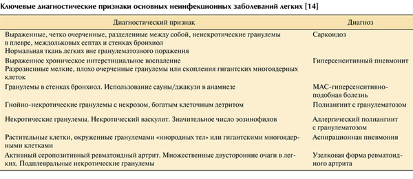 Дифференциально-диагностические признаки основных неинфекционных заболеваний легких приведены в таблице. Ключевые диагностические признаки основных неинфекционных заболеваний легких [14]
