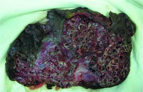 При макроскопическом исследовании висцеральная плевра обоих легких неравномерно утолщена с фрагментами спаек, на разрезах во всех отделах легких определяются множественные округлые воздушные полости диаметром от 1 до 5 см (рис. 11) Рисунок 11. Макропрепарат легкого на разрезе. Множественные полости различного размера. .