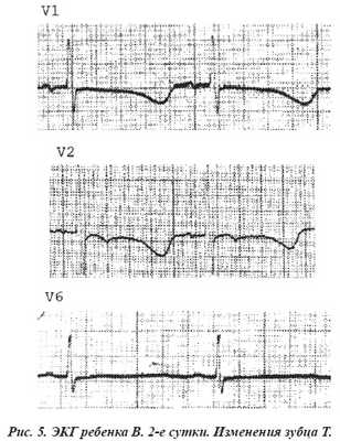 На электрокардиограмме наиболее часто регистрировалась синусовая тахи- и брадиаритмия (62,3%), изменение конечной части желудочкового комплекса в виде конкордантных и дискордантных изменений сегмента ST, изоэлектричный зубец Т, депрессия сегмента ST, инверсия зубца Т (рис. 2, 3, 4, 5). Нарушение проводимости мы выявили у 40, а нарушения ритма у 30 новорожденных.