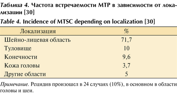В 2011 г. M. Tarallo и соавт. провели ретроспективное исследование МТР (n=327; 213 мужчин, или 65%; 114 женщин, или 35%). Наиболее часто МТР локализовался в шейно-лицевой области — у 220 (67,3%) больных, на туловище — у 33 (10,1%), в других областях — у 29 (8,86%), на конечностях — у 32 (9,8%), на коже головы — у 13 (4%), что подтверждает данные более ранних исследований (табл. 4)