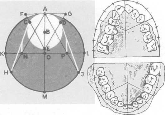 Гербст модифицировал диаграмму Хаулея, заменив боковые прямые линии дугами CN и DP, центрами которых являются точки L и K, лежащие на пересечении большой окружности с диаметром перпендикулярным АМ. Дуга CN описывается радиусом LC , а DP - радиусом KD . Таким образом, дуга NCADP имеет закругленные боковые участки и является полуэллипсом, что соответствует нормальной форме верхнего зубного ряда.