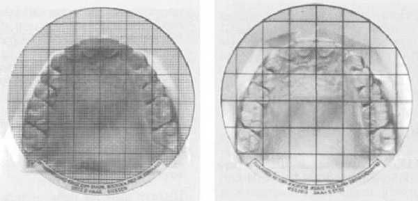 Симметроскопия. С помощью этого метода изучают место расположения зубов в трансверсальном и сагиттальном направлениях. Ортокрест (ортодонтический крест) применяют для экспресс-диагностики. Он представляет собой прозрачную пластину, на которую нанесен крест с миллиметровыми делениями или миллиметровая сетка с делениями через 1—2 мм. Пластину накладывают на гипсовую модель верхней челюсти, ориентируя крест по срединному небному шву, и затем изучают расположение зубов по их отношению к срединной и поперечной линиям (рис. 13.24).