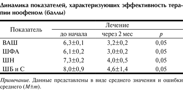 Ноофен назначался по 500 мг (2 капсулы) 3 раза в сутки. В качестве основных критериев оценки эффективности использовались: динамика показателей визуальной аналоговой шкалы (ВАШ), шкал физической активности (ШФА), настроения (ШН), боли и сна (ШБ и С) из краткого опросника «Качество жизни».