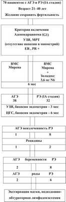 За период с 02.09 по 07.12 г. в МНИОИ им. П.А. Герцена проведено лечение 121 пациентки по приведенным схемам с использованием ВМС Мирена и золадекса. Проанализированы истории болезни 38 больных с АГЭ и 32 РЭ IА стадии (схема). Схема 1. Дизайн исследования.