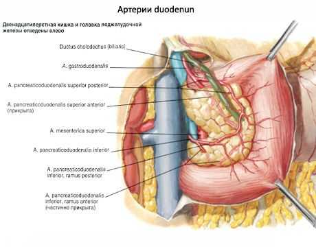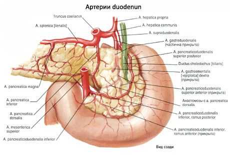 Верхняя часть (pars superior), или луковица, самая короткая (3-6 см) и широкая (до 4 см), идет от привратника вправо и кзади и образует верхний изгиб двенадцатиперстной кишки. Почти 3/4 окружности этой части кишки покрыто брюшиной. При умеренно или сильно наполненном желудке верхняя часть расположена почти сагиттально, при пустом - более поперечно. Верхняя поверхность ее граничит с задней частью квадратной доли печени, затем перекрещивает правую часть собственной печеночной артерии и общий печеночный проток. Внизу верхняя часть двенадцатиперстной кишки соприкасается с верхней частью головки поджелудочной железы и поперечной ободочной кишкой. Позади верхней части в толще печеночно-двенадцатиперстной связки находятся общий печеночный проток (справа), собственная печеночная артерия (слева), воротная вена (сзади и между ними).