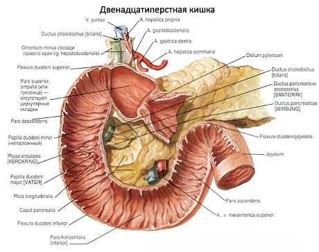 Двенадцатиперстная кишка (duodenum) - начальный отдел тонкой кишки, расположенный на задней стенке брюшной полости. Двенадцатиперстная кишка начинается от привратника желудка, заканчивается двенадцатиперстно-тощекишечным изгибом, расположенным у левого края II поясничного позвонка. В типичных случаях двенадцатиперстная кишка имеет форму подковы, огибающей головку поджелудочной железы. У двенадцатиперстной кишки различают верхнюю, нисходящую, горизонтальную и восходящую части.