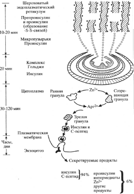 молекулы инсулина является препроинсулин, который синтезируется в эндоплазматическом ретикуломе В-клеток. Сразу же, под влиянием протеолитических энзимов, препроинсулин превращается в проинсулин и транспортируется в аппарат Гольджи, где запасается в виде гранул. Там же протеолитические энзимы расщепляют проинсулин в равных количествах на инсулин и С-пептид, с остатком небольшого количества проинсулина.