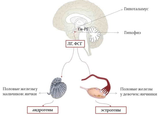 Сигнал воздействует на гипофиз — железу внутренней секреции, играющую ведущую роль в гормональной регуляции организма. Получая сигнал, гипофиз высвобождает половые гормоны, контролирующие половое развитие, — лютеинизирующий гормон (ЛГ) и фолликулостимулирующий гормон (ФСГ). Яичники и яички являются гонадами, то есть половыми железами, вырабатывающими половые продукты (яйца и сперматозоиды), а гормоны ЛГ и ФСГ, стимулирующие работу гонад, называются гонадотропинами.