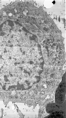 Вместе с тем микобактерии обладают способностью изменять рН цитоплазмы и «арестовывать» эндосомы макрофага [16]. Это означает, что основная масса лизосом будет израсходована на разрушение микобактерий, а новые не образуются. Таким образом, макрофаг практически лишается лизосом и трансформируется в эпителиоидную клетку, которая сохраняет функцию фагоцитоза, но не способна образовывать фагоцитарную вакуоль. В ней почти нет лизосом (рис. 2), Рисунок 2. Эпителиоидная клетка, в цитоплазме которой микобактерии туберкулеза и лишь единичные лизосомы, не образующие фагоцитарных вакуолей. × 15 000. и она становится резервуаром для сохранения микобактерий, которых еще и защищает своей цитомембраной от действия различных провоспалительных интерлейкинов и других цитокинов, обеспечивая нестерильный иммунитет. Это происходит в конце 2-й недели заболевания, когда появляется гиперчувствительность замедленного типа, однако казеозный некроз формируется позже [15].