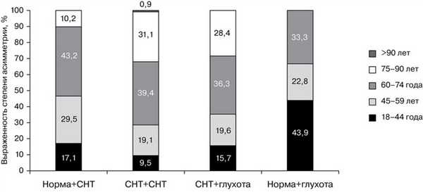 Среди пациентов с типом «норма+глухота» преобладали лица молодого (44%) и среднего (23%) возраста, а среди пациентов с типом «СНТ+СНТ» — лица пожилого (39%) и старческого (31%) возраста (рис. 3). Рис. 3. Распределение пациентов по возрасту при различных типах АСНТ.