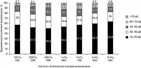 Асимметрия порогов в большинстве случаев выявлялась на одной—двух частотах (55%). Также велика доля (13%) пациентов с асимметрией по всей тон-шкале. Чем выше частота, тем чаще наблюдалась асимметрия порогов слуха (см. рис. 2). Можно предположить, что это связано с большей «уязвимостью» высокочастотного диапазона (базальный завиток улитки) для экзогенных влияний (например, шум), которые могут оказывать несимметричное воздействие на уши. При этом в среднечастотном диапазоне чаще обнаруживалась более выраженная асимметрия порогов (более 40 дБ). Это имеет значение в процессе подбора слухового аппарата, в частности при решении вопроса о возможности билатерального слухопротезирования [13].