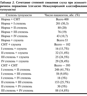 При каждом из типов АСНТ оценивалось сочетание степеней снижения слуха в соответствии с Международной классификацией (табл. 2). Таблица 2. Сочетание степеней снижения слуха при асимметричном поражении (согласно Международной классификации тугоухости) Как следует из представленных в таблице данных, у пациентов с типом АСНТ «норма+СНТ» на хуже слышащем ухе чаще всего диагностировалась I степень тугоухости, при типе «СНТ+СНТ» — сочетание I и II степени. При этом в группе «СНТ+глухота» сочетание I степени тугоухости с глухотой встречалось реже всего.