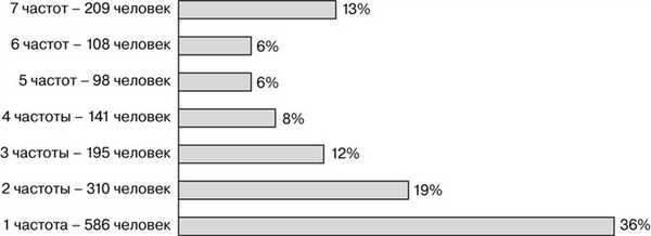 Максимальное число случаев АСНТ (1749 человек) было выявлено при использовании третьего подхода к оценке асимметрии. Процентное распределение частот, на которых выявлялась асимметрия порогов слуха посредством данного подхода, показано на рис. 1. Рис. 1. Количество частот, на которых выявлялась асимметрия тональных порогов (разница 15 дБ и более; пациенты с односторонней тотальной глухотой исключены из подсчета). Чаще всего имела место асимметрия слуха только на одной частоте (36%), реже — на 2—6 частотах. Из подсчета были исключены пациенты, у которых диагностировалась глухота с отсутствием реакции на звук интенсивностью 120 дБ нПС на соответствующей частоте. Для оценки связи между возрастом пациента и количеством частот, на которых была определена асимметрия порогов, использовался критерий Пирсона. Между данными признаками не было найдено достоверной корреляции (rху= -0,1).