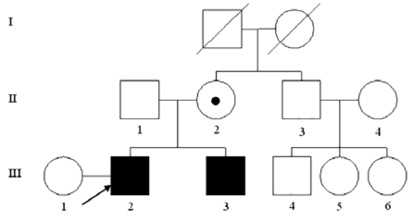 Патологии других органов и систем не выявлено, что исключает наличие синдромальных форм наследственной тугоухости. Составлена родословная (см. рисунок), пациент (III:2) имеет больного брата (III:3) с тем же заболеванием — тяжелой прелингвальной тугоухостью (82—90 дБ). У матери (II:2) не наблюдается снижения слуха. Была взята кровь у больного, родного брата и их родителей для проведения ДНК-диагностики заболевания. От компьютерной томографии пирамиды височной кости и более полного обследования семья отказалась.