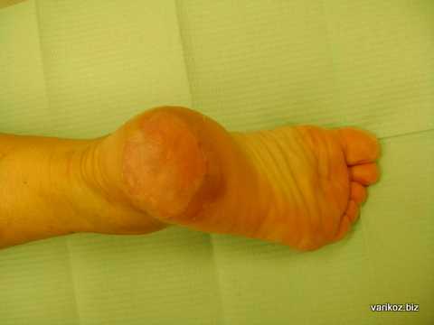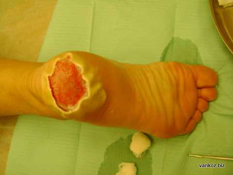 На фото выше - химический ожог, полученный после неправильного применения димексида. Отслоенный эпидермис частично иссечен, под ним видна раневая поверхность.